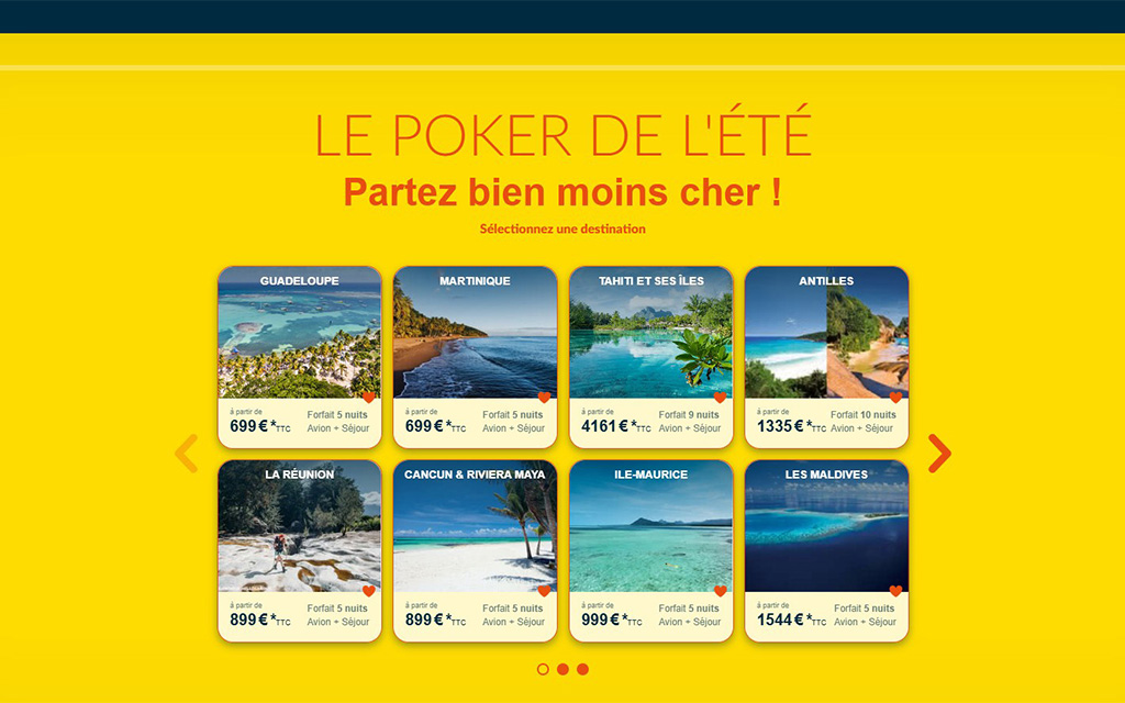 Brochure 100% en ligne, avec accès direct au stock en temps réel, le Poker d’Exotismes s’attache à la simplicité de lecture avec des offres présentées par destination et par prix croissant, chaque produit étant signalé sous forme de carte à jouer avec la mention « forfait 5 nuits, avion + séjour ».