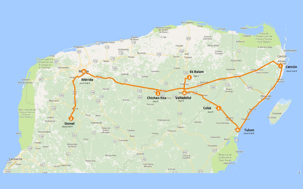 Cet autotour propose un itinéraire alternant découverte des principaux sites archéologiques mayas et des villes coloniales tout en traversant des paysages tropicaux, en s’arrêtant dans les villages ou pour se baigner dans les cénotes (piscines naturelles) :