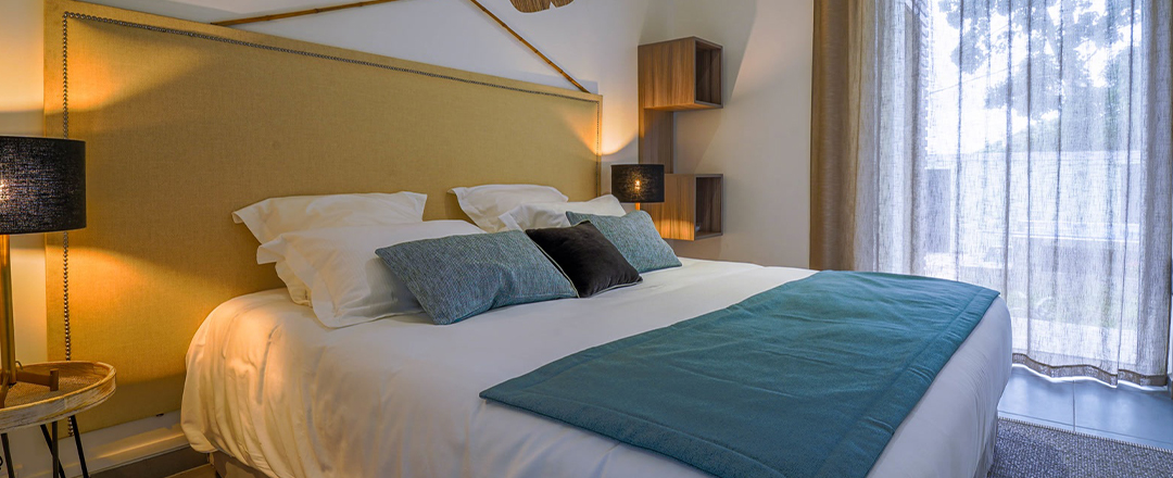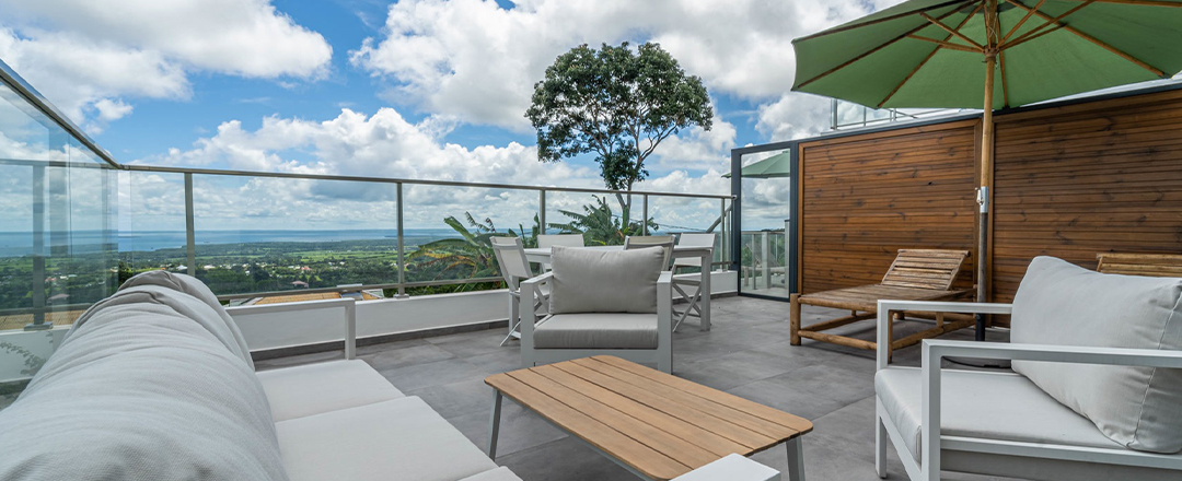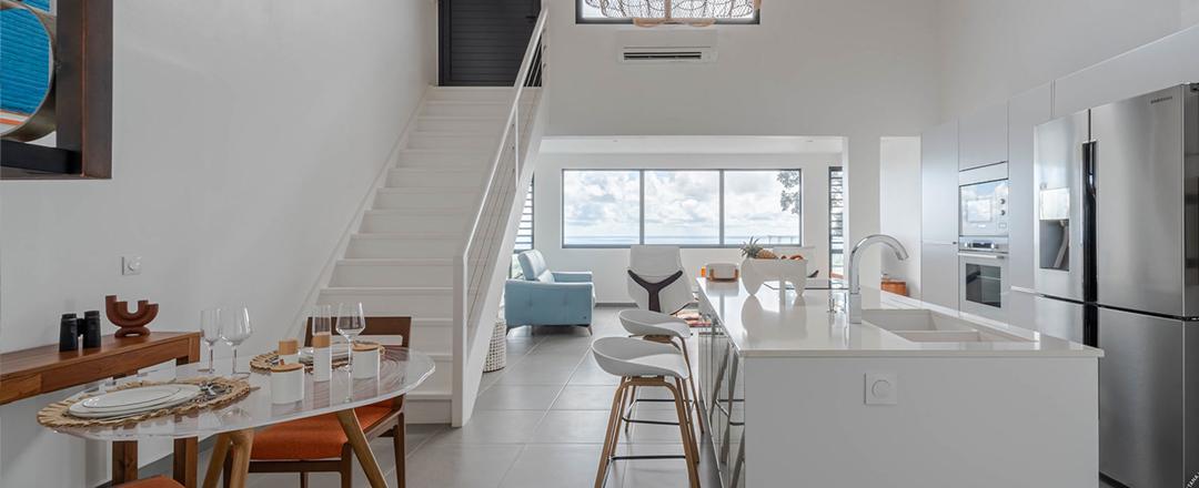 LUXE TROPICAL (132m2) : Capacité 2 à 4 pax équipée de 2 chambres, 2 salles de bain, séjour, coin cuisine, mezzanine et terrasse